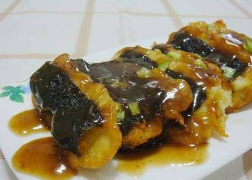 - 另起鍋放少許油,倒入適量的素蚝油攪勻,然後勾欠至濃稠,淋在煎好的薯餅上,撒上熟白芝麻即可。