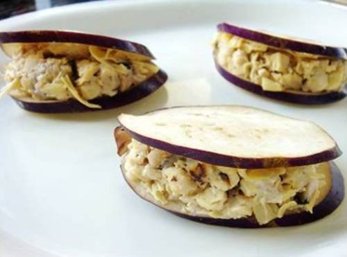 - 茄盒馅料的做法: 1)土豆煮熟去皮压成细泥;香菇、马蹄洗净切细碎;大豆蛋白泡软挤干水分切碎。 2)将香菇和大豆蛋白用油炒香,拌入土豆泥、马蹄,用盐、蘑菇精调味。