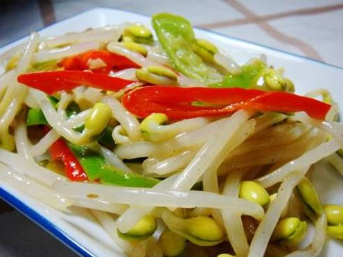 起锅热油,爆香姜末,放入青、红椒丝和黄豆芽一起快速翻炒,用盐、蘑菇精调味后即可出锅